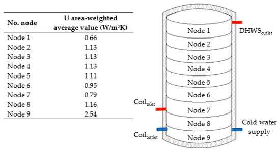 For the validation of the hot water tank model and submerged cooling coil, the experimental data in the literature were compared to data obtained through the simulation. The results obtained by Cruickshank and Harrison [29], who used a commercial 270 L hot water tank, were considered. This tank uses fiberglass insulation with a 0.047 m thickness, and a 0.036 W/mK thermal conductivity. The hot water tank has a height of 1.5 m and a 0.45 m internal diameter. In the experiment, the water was heated and mixed at a temperature of 54.0 °C in an environment of 20 ± 0.03 °C over 48 h. Readings were carried out every 3 min, with temperature sensors spaced every 15 cm in a vertical array to obtain stratification readings. The heat loss coefficients for each node were considered for the validation of this model, as shown in Figure 5.