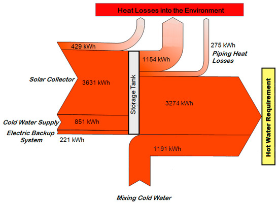 Under these conditions, the solar collector and the water supply input at ambient temperature provides 96% of the required energy, with a total energy of 5673 kWh, whereas the auxiliary heater must provide the remaining 4% with 221 kWh to meet the annual hot water requirement. There are partial losses through the environment of 1858 kWh, taking into consideration the losses of the solar collector, the hot water tank, and the supply pipes.