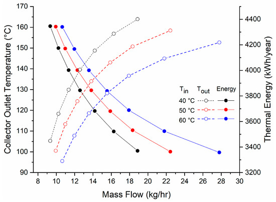 Figure 8 shows the thermal energy produced annually with each established temperature difference, and the required mass flow.