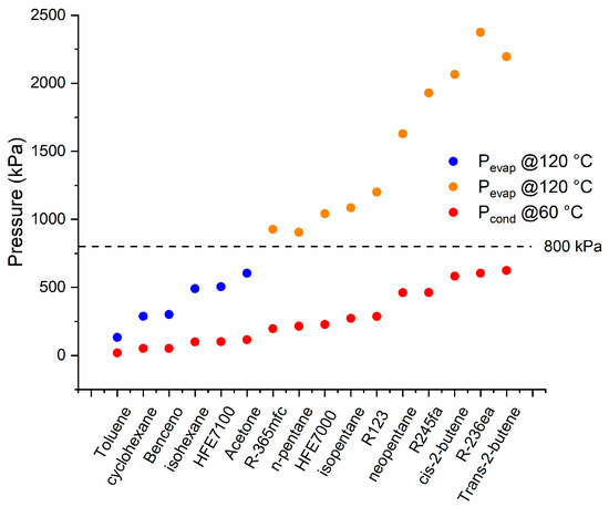 There are a number of studies related to working fluid selection for the ORC [17,18,19,20,21]; however, they generally focus on operation temperatures. In contrast, in this study the (relatively low) operation pressures that the SDHWS may withstand were first considered, and later their influence on the fluid properties and the thermal performance system were evaluated.