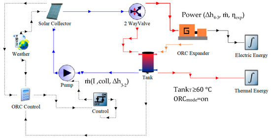 There are different studies in the field of optimization of residential solar ORC configurations. A system with flat plate collectors with a heat source of 3.542 kW [12] uses a heat exchanger for condensation and a subsystem for waste heating to heat the water in a hot water tank. A configuration of 100 m2 of a parabolic channel with ORC [13] uses a heat exchanger to transfer heat from the parabolic channel, and operates as an evaporator for the ORC. A configuration of an evaporator SDHWS used as an intermediate heat exchanger to heat the working fluid of the ORC system [14] additionally uses a system of indirect heating for the DHWS and three flat plate solar thermal collectors. A configuration with a solar area of 15 m2 and thermal energy storage [15] maintains and uses energy to mitigate solar energy variations in the ORC. A solar system with a linear Fresnel collector, with a total surface area of 148 m2, thermal storage with phase change, and an ORC [16], uses the tank indirectly for phase change as the evaporator from the ORC.