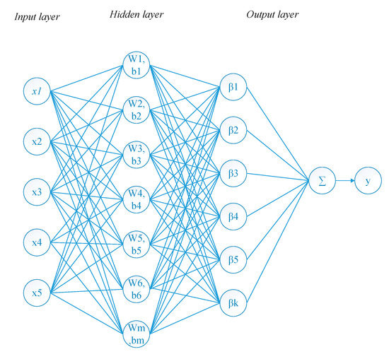 The structure of the prediction model that is built using the proposed method is similar to those of other ELM-based methods. Figure 1 shows the basic structure of the method. Generally, the network includes one input layer, one hidden layer and one output layer. The hidden output is calculated using the given input vectors and the weights and the biases of the hidden nodes which are randomly assigned [54]: