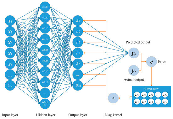 Recently, forecasting models with parameters that are free from adjustments have gained increasingly more attention due to their fast training speeds for the models [54,55,56]. Combined with the correntropy, these algorithms have shown great potential in real-world applications. For example, Guo et al. [57] developed a novel training method for echo state networks (ESNs) based on a correntropy induced loss function (CLF), which provides robust predictions for time-series signals. Similar to ESNs, extreme learning machines (ELMs) have received great attention on fast learning due to the random assignments of the hidden layer and being equipped with simpler structures, such as single layer feedback networks (SLFNs) [58,59,60]. It has been proven that the hidden nodes can be assigned with any continuous probability distribution, while the model satisfies the universal approximation and classification capacity [61]. In particular, the extreme learning machine has been applied and received a high reputation for predicting production processes [62,63], system anomalies [64], etc. [65]. In [66], the authors first developed the correntropy-based ELM that uses the regularized correntropy criterion in place of the MSE with half quadratic (HQ) optimization which is called the regularized correntropy criterion for an extreme learning machine (RCC-ELM). Later, Chen et al. [67] extended the dimensions of the correntropy by combining two kinds of correntropy together to enhance the flexibility of the model to generate more robust ELM called ELM by maximum mixture correntropy criterion (MMCC-ELM). The experimental results show that the learning method performs better than the conventional maximum correntropy method. Although the RCC-ELM and MMCC-ELM possess high robustness compared with other ELM methods, the corresponding correntropy is constrained by no more than two kernels. The kernel bandwidth required for the assignments by users in advance is likely to degrade the model due to the improper description on the probability distribution of the signal with the correntropy.