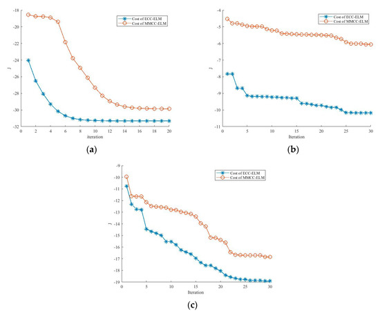 In this section, the time complexity of the proposed method is analyzed and compared with the other algorithms. The main time complexity of the ECCELM comes from the cooperating evolution process and the training process of the model. The cooperative evolution contains the calculations of the influence coefficients and the particles updating with the time complexity of O(ItNK2), where It is the number of iterations, N is the number of particles and K is the number of disperse values of the outputs. To train the ELM, the procedures share the same time complexity as the RCC-ELM and MMCC-ELM, which is O(IhNl(5M+M2)), where Ih is the amount of iterations for training and Nl is the number of training data. Additionally, M is the number of hidden nodes. Therefore, the time complexity of ECC-ELM is O(IhNl(5M+M2+ItNK2)), which is slightly higher than those of the RCC-ELM and MMCC-ELM but it satisfies the requirements in most applications.