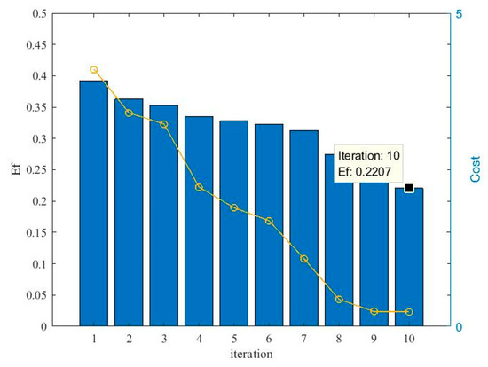 Figure 9 depicts the evolutionary process of the PSO procedure. It shows that the Ef value quickly decreases during the evolutionary process and stabilizes within 17 iterations, resulting in the optimal solution that is provided by the swarm.