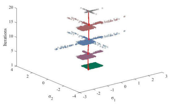 To illustrate the evolutionary processes for optimizing the bandwidth, Figure 8 depicts the distributions of the particles and the evolution of the optimal solutions. It can be seen that the distribution of the particles dynamically changes based on the state of the PSO process. The optimal solution is adjusted and stabilizes during the process, which allows the optimal solution of the bandwidth assignments to generate a more accurate model.