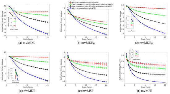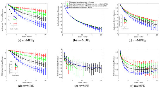 To assess the ability of the mvMDE methods to characterize short signals in comparison with mvMFE and mvMSE, we use trivariate noise and WGN with length of 300 sample points. The results for the mvMDE, mvMSE, and mvMFE approaches at temporal scales 1 to 20 are depicted in Figure 2a–f, respectively. The results show that only mvMDEI is able to distinguish these four different kinds of noise signals at scale factor 1. For the higher temporal scale factors, mvMDEI and mvMDE distinguish these time series, showing a limitation of mvMDE for the discrimination of white from noise at lower scale factors and also the importance of considering higher temporal scales for the mvMDE technique. As can be seen in Figure 2a,d, the mvMDEI and mvMDE methods better discriminate different dynamics of the noise signals. However, the mvMSE values are undefined at higher scale factors. It is worth mentioning that we compared mvMDE with the original algorithms of mvMSE and mvMFE. However, more recent studies on entropy estimation of short physiological signals provided methods to deal with this issue [17,42].