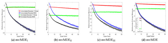The correlated bivariate noise is the most complex signal using the mvMDEII, mvMDEIII, and mvMDE. The second most complex signal is the uncorrelated bivariate noise, as can be seen in Figure 3. The decreases of the uncorrelated bivariate WGN profiles using mvMDEII, mvMDEIII, and mvMDE are the largest, evidencing the fact that the uncorrelated WGN is the least complex time series. These facts are also in agreement with the previous studies [8,14,17]. Therefore, as desired, the mvMDEII, mvMDEIII, and mvMDE deal with both the cross- and within-channel correlations.