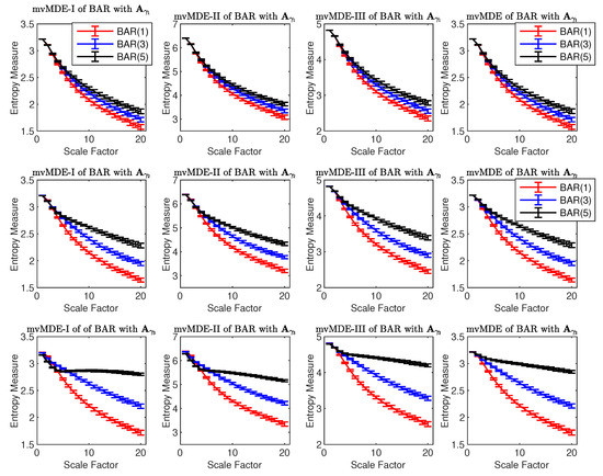 The ability of the mvMDE methods to characterize multivariate AR processes is further evaluated using combinations of BAR(1), BAR(3), and BAR(5) with , , and . The results obtained by the mvMDEI, mvMDEII, mvMDEIII, and mvMDE methods are shown in Figure 4. As expected, when the lag order increases, the complexity of the corresponding time series using the mvMDE approaches increases, in agreement with the fact that a larger lag order denotes a more complex time series [8]. As the elements of are smaller than those of and , the behaviour of the profiles obtained by the mvMDE methods are more similar to the results for WGN (see Figure 1). In fact, the smaller the elements of , the less complex the BAR, leading to lower entropy values at higher scale factors.