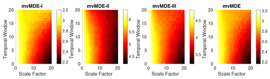 In order to investigate the dependence of the mvMDE methods on the sensitivity to changes in the signals, we generated BAR(3) with length of 10,000 sample points and sampling frequency of 150 Hz that linearly changes from to . In fact, the elements of the diagonal of A are constant and those of anti-diagonal linearly increase from 0 to 0.17, leading to more complex series. We moved a bivariate window—termed temporal window—with length 2000 samples and overlap along this BAR(3) signal. The entropy of each bivariate temproal window is caculated. The results, depicted in Figure 5 show that when the time window is occupied at the beginning of the BAR(3) (), the mvMDEI, mvMDEII, mvMDEIII, and mvMDE values at higher scale factors are the smallest, showing the least complexity of BAR(3) in lower temporal windows, while their corresponding entropy values in the end of BAR(3) process () are the largest. It is worth noting that as described before, mvMDEII needs a larger number of sample points to appropriately characterize the dynamics of signals. This fact can be observed in Figure 5, showing mvMDEII is the least able to distinguish such changes.
