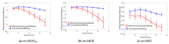 (1) Dataset of Stride Interval Fluctuations: For the self-paced versus metronomically-paced stride interval fluctuations, the results obtained by the mvMDEIII, mvMDE, and mvMFE, respectively depicted in Figure 6a–c, show that the self-paced unconstrained walk’s fluctuations have more complexity and greater long-range correlations than the metronomically-paced walk’s series, in agreement with those reportred in [2]. We did not use mvMDEII, as the signals do not follow the typical number of samples required for mvMDEII. To compare the results, the CV values for both the metronomically- and self-paced walk (MPW and SPW) at scale factor 4, as a trade-off between the long and short scales, are shown in Table 4. The CV values for the mvMDEIII- and mvMDE-based profiles are smaller than those for mvMFE, showing the superiority of the proposed methods over mvMFE in terms of the stability of results. The smallest CV values are achieved by the mvMDE.