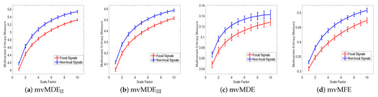 (2) Dataset of Focal and Non-focal Brain Activity: For the focal and non-focal EEG recordings, the results obtained by mvMDEII, mvMDEIII, mvMDE, and mvMFE, respectively depicted in Figure 7a–d, show that the focal time series are less complex than the non-focal ones, in agreement with previous studies [40,43]. The CV values for the focal- and non-focal-based results at scale 6 are shown in Table 5. All the mvMDE-based CV values are smaller than those using mvMFE, showing more stability of the results obtained by the proposed methods. Moreover, the CV values for mvMDE are smaller than those for mvMDEIII, and the latter ones are smaller than those for mvMDEII, suggesting that the mvMDE leads to more stable profiles.