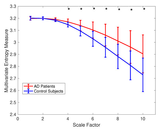The Mann–Whitney U-test was used to assess the differences between the mvMDE and mvMFE profiles at each temporal scale for AD patients versus controls, because the mvMDE and mvMFE values at each scale factor did not follow a normal distribution. The temporal scales with p-values smaller than 0.001 are shown with * in Figure 8 and Figure 9. The p-values show that the mvMDE, compared with the mvMFE, significantly discriminated the controls from subjects with AD at a larger number of scale factors. Moreover, the smallest p-value was achieved by the mvMDE, evidencing the superiority of mvMDE over mvMFE.