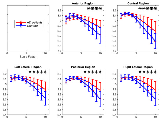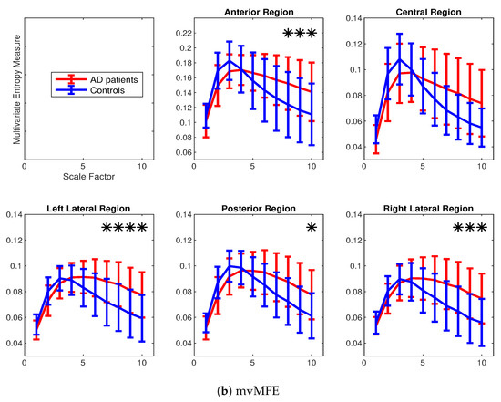 The average and SD of mvMDE and mvMFE values for five regions are respectively shown in Figure 9a,b. As can be seen in Figure 8 and Figure 9, the average mvMDE and mvMFE values for AD patients are smaller than those for controls at lower scale factors (short-time scale factors), while at higher scales, the AD subjects’ recordings have larger entropy values (long-time scale factors) for both the mvMFE and mvMDE, in agreement with [21,44,45]. Because the larger the number of channels, the smaller the mvMSE and similarly mvMFE values [21], the entropy values for anterior region are larger than those for the other four regions. It is worth noting that we only use mvMDE, as the signals do not follow the typical number of samples required for mvMDEII and mvMDEIII.