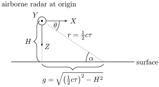 The simulation geometry is shown in Figure 2, where the airborne radar is at an altitude H above the surface traveling with velocity . We will assume a coordinate system fixed to the phase center of the radar antenna, such that the antenna is at the origin, the X-axis is pointed parallel to the surface and in the plane of symmetry of the aircraft, the Y-axis is pointed out the right side of the aircraft and parallel to the surface, and the Z-axis is pointing down. In this work, we will assume that always lies in the X-Z plane (i.e., no crabbing). Because we are seeking to model the scattering characteristics as a function of t and , we will need to express all spatial quantities in terms of these temporal variables.