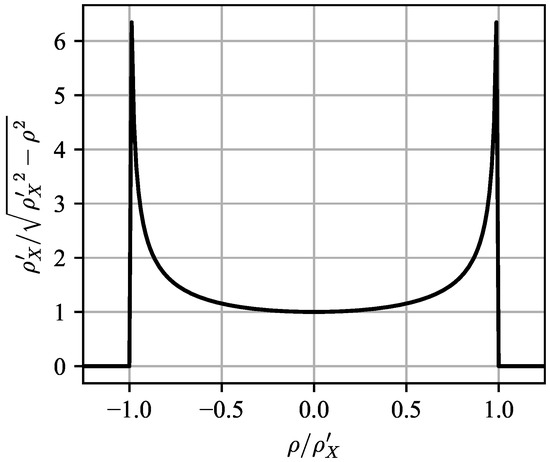 A constant- cut of Equation (21) without the antenna pattern is plotted in Figure 4, with and . The singularity of the scattering function at is extremely critical for modeling nose-aspect clutter, as it serves to narrow the Doppler spread of the antenna pattern. For side-looking antennas, however, the singularities are irrelevant as the Jakes spectrum is flat near .