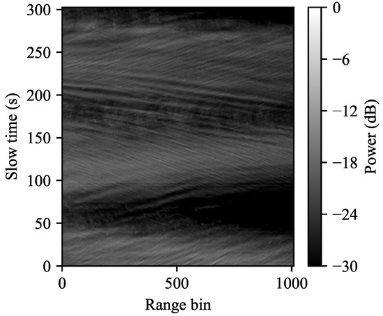 where represents downrange delay (i.e., “fast time”), t is absolute time (“slow time”), and is thermal noise. In the literature, is commonly referred to as the time-varying impulse response. In this work, h will include the transceiver, antenna, atmospheric propagation, and backscattering environment, so is essentially the output of the transmit D/A, and is the input to the receive A/D, prior to matched filtering. Polarization considerations are contained in the antenna pattern and surface scattering radar cross-section (RCS). Variations in with respect to t represent channel-induced Doppler shifts. In the case where the entire scenario is static, (i.e., h is LTI), and the integral in Equation (1) reduces to a convolution. In applying the LTV model to a radar system, we use the following assumptions:
