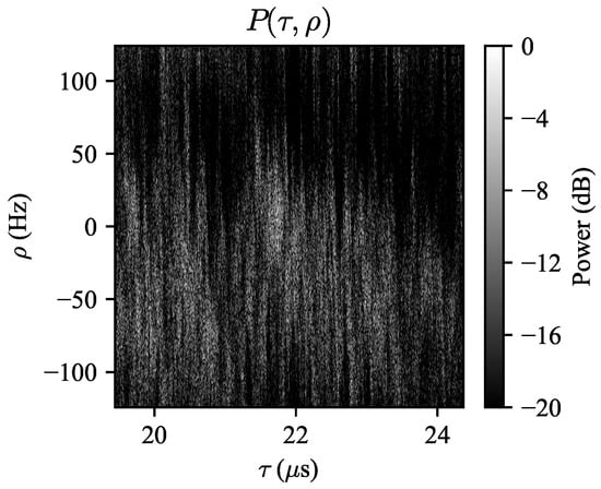 The function is known as the system correlation function [3,48]. By taking the Fourier transform of with respect to , we can view the Doppler spectrum of the return as a function of delay, referred to in the literature as the “scattering function” :