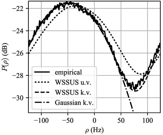 The predicted spectrum using the WSSUS framework with the MaxEnt priors, labeled “WSSUS u.v.” for the unknown variance case, and “WSSUS k.v.” for the known variance case, as well a plot of the “standard” Gaussian Doppler spectrum model for , are shown in Figure 9. It can be seen that both predicted spectra capture the shape of the empirical spectrum; the specification of the variance produces a spectrum that is within approximately 1 dB of the empirical spectrum at all frequencies. The Gaussian model for produces excelled agreement for in the main lobe but does not predict the presence of the sidelobe clutter floor of approximately –29 dB. This could lead to excessively optimistic predictions of radar performance in the sidelobe clutter region.