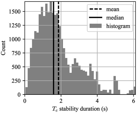 To test this assumption, we created a statistic called the “stability duration” of , which is defined as the region of time over which changes less than X%. (We used 10 percent, but this is admittedly arbitrary.) Because is itself a function of time, the stability duration was computed relative to the value of at each timestep. A histogram of the stability times over the entire record length is shown in Figure 11. It can be seen that the median stability time is about 1.5 s, with the mean being even higher. Thus for any waveform with a PRI on the order of one millisecond or less (i.e., PRF > 1 kHz, which is very common) and integrating less than 1000 pulses, this is a perfectly reasonable assumption. This assumption may be violated for low-PRF waveforms with long integration times, such as those used in surveillance radars.