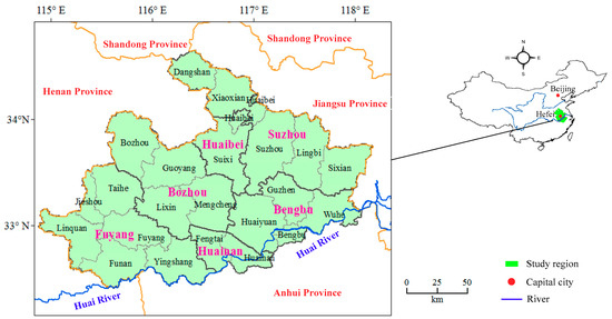 As indicated in Figure 1, the Northern Anhui province, located in the hinterland of East China and North of Huai River with longitude between 114°58′ and 18°10′ and latitude between 32°45′ and 34°35′, has jurisdiction over six cities including Suzhou, Bozhou and Bengbu and 17 counties including Dangshan, Lingbi, and Huaiyuan. The Northern Anhui province is mainly plain with a total area of 36,694 km2, a natural slope between 0.13% and 0.83%, and an average altitude between 20 m and 40 m. In addition, the Northern Anhui province is located in the transition zone between the north subtropical humid climate and half of the moist monsoon climate. The annual average precipitation is between 770 mm to 950 mm, but varies significantly both from spatial and temporal scales, which presents an increasing trend from north to south. Moreover, the annual average precipitation during the flood season from June to September accounts for 70% to the total mainly with the form of rainstorm, which is beneficial for the occurrence of waterlogging in the flood season and drought in the non-flood season. Water shortage is also serious in the North Anhui province with the annual average water resources availability of 12.87 billion m3, which is half of the provincial level and even below 0.75 of the average national level. Compared with the surface water resources availability, the ground water resources are abundant, and the ratio for surface and ground water resources is approaching 1: 1 in the North Anhui province.