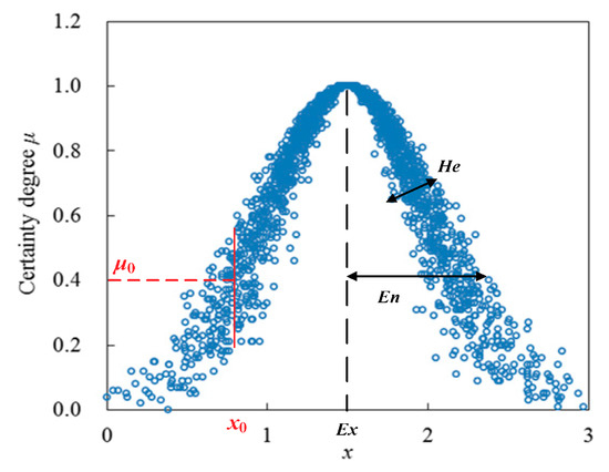 Suppose U is a universal set denoted by precise data, and C is the qualitative concept related to U. If randomly generated data x (x ∈ U) is related to concept C, then the membership degree of random data x belonging to concept C is named as a certainty degree [16,24]. Specifically, let C(Ex, En, He) be a qualitative concept C related to precise set U and described by average Ex, entropy En, and hyper-entropy He in which average Ex denotes the most representative sample data of concept C, and can be adopted to reveal the concentration condition of samples. Entropy En is related to the uncertainty of sample distribution and reflects both the random dispersing degree of cloud drops and acceptable range of concept C. Hyper-entropy He is the uncertainty degree of entropy, which reflects the concentration condition of samples under a certain deviation condition [16]. Thereby, if the distribution of variable x satisfies x ∈ N(Ex, En′2) and En′ ∈ N(En, He2), then the distribution of variable x within set U is defined as one-dimensional normal cloud, and data point [x0, μ0(x)] is defined as the cloud drop [16,24]. Figure 2 illustrates the distribution of cloud C, which satisfies Ex = 1.5, En = 0.5, and He = 0.1.