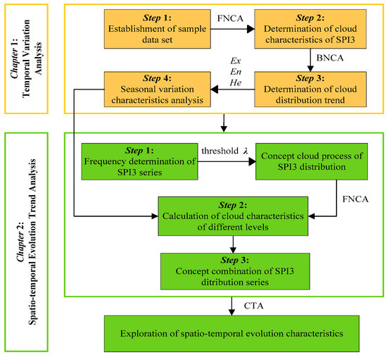 The primary innovation of this study is to explore the spatial-temporal distribution features of drought in the Northern Anhui province from seasonal scale through re-fitting the distribution pattern of the SPI index via a cloud transformation algorithm instead of Pearson-III distribution. Thus, in the first section, the approaches applied in this paper were briefly introduced. In the second section, based on the frequency analysis of historical SPI series, the initial cloud characteristic parameters were determined. Then, concerning the similarity of different cloud patterns, the ultimate cloud distribution modes were obtained by conception zooming and merging, which were applied to reveal the spatial-temporal distribution features of drought. Thus, the analyzing framework of this manuscript can be illustrated in Figure 3.