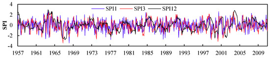 Frequently, the SPI index can be applied to monitor the occurrence of drought, and drought will result in disaster when it occurs intensively and extensively in densely populated areas [31]. The overall variation trend of SPI series from one-month, three-month, and 12-month time scales for the Northern Anhui province through 1957 to 2010 was illustrated in Figure 4.