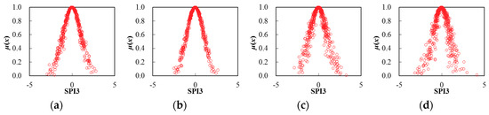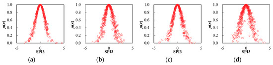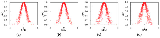It can be revealed from Figure 4 that, (1) influenced by short-term precipitation events, the SPI1 series fluctuated significantly through 1957 to 2010, which was applied as the data basis to derive a different drought conceptual cloud, and then further explore the spatial evolution characteristics of drought in this study. (2) Concerning the consideration of precipitation in the previous three months, the variation of SPI3 series was relevant with agricultural drought [19,22]. The SPI12 series revealed the overall yearly variation trend of drought and waterlogging-related disasters. Therefore, the SPI3 and SPI12 series were applied to explore the temporal evolution characteristics of drought from seasonal and yearly scales in this study.