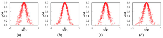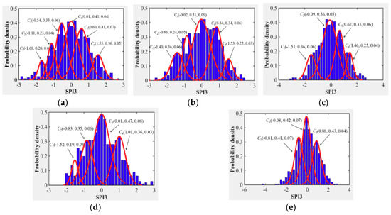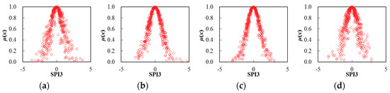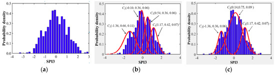 According to the procedures of CTA and conception zooming coupling approach indicated in Section 3.3, first, the calculated SPI3 series was applied to determine the probability density distribution histogram of drought, which was shown in Figure 11a. Then, supposing the threshold values δ1 and δ2 equaled to 0.1 and 0.01, respectively, which were used to control the occurrence frequency of remaining cloud drops, and the four initial conceptual cloud distributions of drought were obtained through the CTA method, as indicated in Figure 11b. Lastly, the ultimate three cloud distribution of drought for different drought intensity levels could be derived through a subtle adjustment of entropy values of initial drought cloud distribution and a merging process, which were illustrated in Figure 11c.