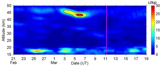 Figure 1 shows the time-altitude intensity of EP for the altitude from 15 km to 50 km above the EQ epicenter. The EP values around the tropopause (about 16–18 km altitude) are, in general, larger than at other altitudes. The temperature inversion near the tropopause caused this enhanced band [49], and we are not concerned with it here. Our focus is on the regions, where EP was enhanced several days before the EQ. For illustrating the significance of the EP-enhanced region, we circled the “high-EP” and “extremely-high-EP” regions in the figure, where the EP values were larger than the quadruple and octuple of the reference value, respectively. These thresholds are different from the ones in our Kumamoto case [41], and we will discuss this difference later. As shown in Figure 1, EP was significantly enhanced around the stratopause (about 43–47 km altitude) during 3–7 March, approximately 4–8 days before the EQ. This enhancement first appeared at 47 km altitude on 3 March and then descended to 43 km altitude while EP reached its maximum value during 5–6 March. Afterward, EP started to decay and the peak altitude of EP returned to a higher level of 45 km. Thus, the wave activity was reduced a few days before the EQ day, and kept low during the week after the EQ.