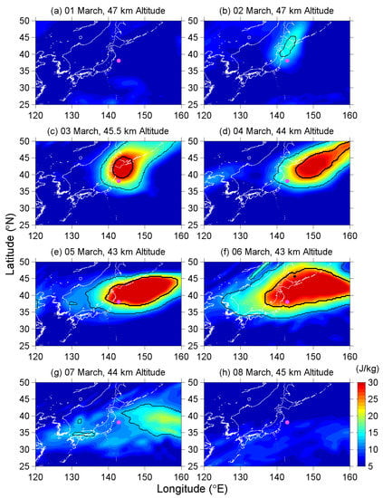 On 1 March in Figure 2a, the wave activity was low over northeast Asia and Pacific offing. Subsequently, an active region appeared around the Japanese Tohoku and Hokkaido area on 2 March (Figure 2b). The wave activity intensified quickly, and then exceeded the extremely-high-EP threshold on 3 March (Figure 2c). This active region further expanded in all directions but mainly eastward on the following days (Figure 2d–f), and covered a wide area with the dimensions of more than 2500 km (in longitude) by 1500 km (in latitude) on 6 March. Being coincident with the result in Figure 1, the EP values around the Tohoku area were sustained at a high level, although the highest value was located at the northeast of the EQ epicenter. After the most developed day on 6 March, the wave activity decayed on 7 March, and the EP values that were around the EQ epicenter no longer exceeded the higher EP threshold value (Figure 2g). Finally, the active region disappeared on 8 March (Figure 2h), and the wave activity remained in a calm state until one week after the EQ day (although the figures of the following days are not shown here).