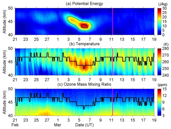 Figure 4 shows the same parameters within the same range and period as Figure 3, but is observed by TIMED/SABER. The enhancement of AGW activity, the descent and heating of the stratopause, and the reduction of ozone are all evident. The stratopause height descended from 46.4 km (2 March) to 44.4 km (6 March) and then ascended to 46.2 km (10 March) altitude. The stratopause temperature was heated from 263.00 K (1–2 March) to 270.18 K (5–6 March), and then cooling to 260.29 K (9–10 March). The ozone mixing ratio at 45 km altitude was reduced from 7.98 ppm (1–2 March) to 7.24 ppm (5–6 March) and then increased to 7.92 ppm (9–10 March). The accuracies and precisions of SABER measurements at 45 km altitude are 1.0 K and <0.3 K for temperature, and 10% and 2% for ozone mixing ratio, respectively [50], with these being smaller than the magnitude of the observational anomalies.