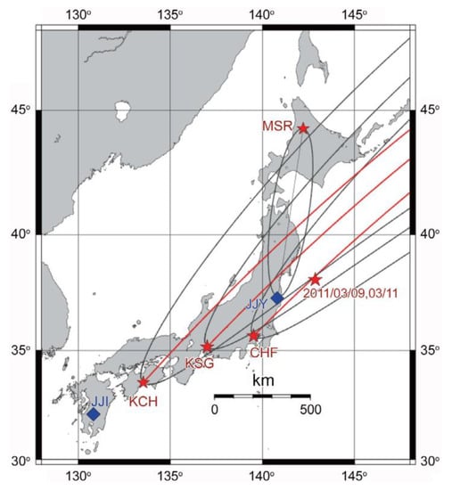 The relative locations of two Japanese very low frequency/low frequency (VLF/LF) transmitters (JJY (Fukushima) and JJI (Miyazaki) indicated by blue diamonds) and VLF receiving stations (Moshiri (MSR), Chofu (CHF), Kasugai (KSG), and Kochi (KCH) shown with red stars). Three red lines are the propagation paths associated with the American transmitter, NLK, together with their corresponding wave sensitive areas in thin black lines defined by Fresnel zones (elliptic zones). The most important one is the NLK-CHF path. For comparison, the great-circle path for JJY-MSR is also plotted. The epicenters of the main shock and its foreshock were nearly the same, as indicated by a red star in the sea. Taken from [52].