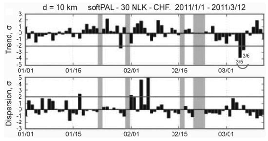 Temporal evolutions of the propagation characteristics for the NLK-CHF path. The top panel refers to the average nighttime amplitude (called trend), and the bottom, to the dispersion (in amplitude). All of these values are normalized by their corresponding standard deviation (σ). A clear anomaly as extraordinary depletion in trend is observed on 5 and 6 March. Taken from [52].