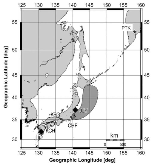A major EQ occurred over the offshore area of Tohoku, Japan (geographic coordinates: 38.10° N, 142.86° E, 24 km depth) at 05:46 UTC on 11 March 2011. This EQ was a reverse-fault type EQ with a moment magnitude (Mw) of 9.0, and numerous studies of precursors for this EQ have been reported (see summary in [42]). A series of foreshocks were recorded in addition to the main event. The initial, and most powerful, foreshock (Mw 7.3) occurred at 38.33° N, 143.28° E, and 8 km depth at 02:45 UTC on 9 March 2011, about two days before the main shock.