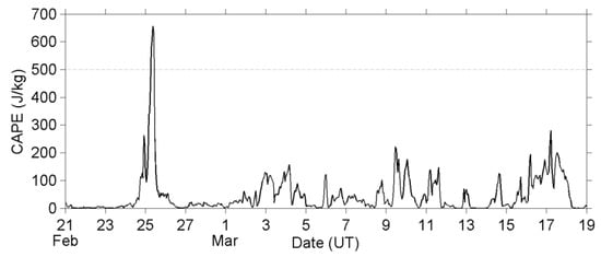 Figure 8 plots the CAPE value at the EQ epicenter. The CAPE value has only exceeded 500 J/kg threshold on 25 February, and this threshold means that the atmosphere is slightly unstable with a low (but not zero) possibility of convective activity [48]. We further check the weather maps and reports that were issued by the Japan Meteorological Agency (JMA) to understand the meteorological situation, and find that a cold front passed the Tohoku area during the period of 24–25 February. Besides, thunderstorm activity was observed at Akita, while the cold front passed there, although the Akita weather station is about 300 km away from the EQ epicenter, and there is no on-the-spot weather report at the EQ epicenter, since this case is an oceanic EQ. We presume that convective systems have developed around the frontal region, and they passed through the EQ epicenter, and further resulted in a high CAPE value on 25 February, based on the above information. Besides, we notice that the weather was sometimes rainy or snowy in early and mid- March around the Tohoku area. Those precipitations were mainly stratiform, but not convective type, and the CAPE value at the EQ epicenter has ranged between 0 and 280 J/kg. No cold front had passed the EQ epicenter, and no thunderstorm had been reported around the Tohoku area from 26 February to 18 March.