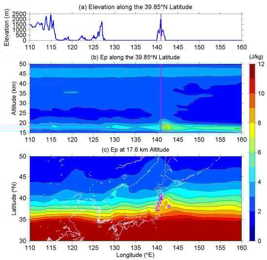 We first look at the EP on the longitude-altitude cross-section along 39.85° N, which is the latitude of Mount Iwate, to investigate the vertical and horizontal distributions of the mountain waves excited by the Ou Mountains. Figure 9a plots the ground surface elevation from 110° E to 160° E longitude, and Figure 9b is the corresponding longitude-altitude Ep intensity from 15 km to 50 km altitude along the 39.85° N latitudinal line. The most intense of AGW activity occurs at 142.2° E longitude and 17.6 km altitude in the lower stratosphere. The horizontal distance of this intense region is only 103 km from Mount Iwate, and it is considered to be the mountain waves excited by the Ou Mountains, since the wave activity is permanently located on the leeward side of the mountains. Additionally, from the literature (e.g., [47,54,55]), we learned that mountain waves are mainly distributed above the mountain ridges or within a range of few hundred km apart from the mountains. Besides, mountain waves usually have relatively low critical levels, and they break in the lower stratosphere, their influences on temperature and wind fields are confined below the lower stratosphere [56,57,58]. The intense wave activity that was observed on the leeward side of the Ou Mountains agrees with the properties of mountain waves on the basis of previous studies, and we can further confirm that the slight enhancements of EP around 115°E and 130°E longitudes are also caused by mountain waves. We tried to plot the EP map at this altitude in Figure 9c to realize the horizontal distribution of the waves at neighbor latitudes since we knew the mountain waves excited by the Ou Mountains are most active at 17.6 km altitude. The EP values are quite large over low-latitudes because the plotted 17.6 km altitude is close to the tropopause there. The contour lines of EP (with 1 J/kg interval) are mainly parallel to latitudinal lines, but are obviously curved around the Ou Mountains sketched by magenta triangles in the figure. EP values enhance in the center of the mountains and the EQ epicenter, and this indicates mountain waves existing on the leeward (east-southeast) side of the Ou Mountains. One might also notice another active region (but not so significantly as the previous one) in the southwest direction of the Ou Mountains in Central Japan, which is caused by the high mountains (>3000 m elevation), but not related with the Ou Mountains.