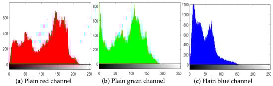 where B i = ( 1 , 2 , 3 , , n ) represents the particular block; r, g, and b represent the red, green, and blue channels, respectively; B R M ( i ) = ( 1 , 2 , 3 , , n ) represents the particular random matrix block; and n is the total number of blocks in the particular image.