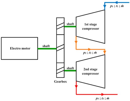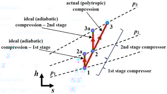 Two-stage compressor is evaluated for energy efficiency according to recommendations in the following literature [44,45,46,47,48]. Energy efficiency formulation with referring to Figure 1 is given below.