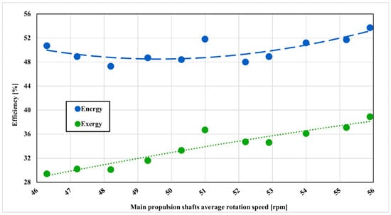 Two-stage compressor energy and exergy efficiency with main propulsion shafts speed variation.