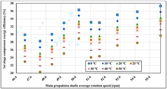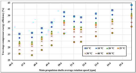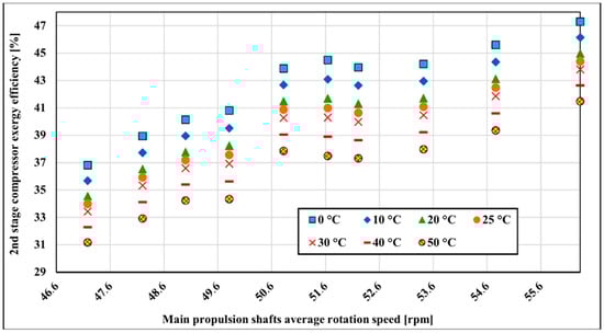 The second compressor stage is less influenced by the surrounding temperature variation compared to the first compressor stage. Exergy changes about 6.1% on average over the measured range (Figure 9). The temperature sensitivity distribution is similar to the first compressor stage and is the lowest in the lower running main propulsion shaft rotation speed where exergy efficiency decreases around 1.01% for every 10 °C from 0–50 °C. The highest temperature sensitivity is at 52.83 rpm of main propulsion shaft rotation speed where it is changing at the rate of 1.39%.