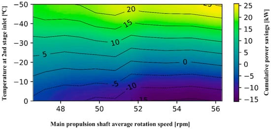The exergy destruction of the two-stage compressor is higher comparing to energy losses where peak destruction is raised to about 320 kW. It may be seen in Figure 5 that the first stage compressor destructs more exergy compared to the second compressor stage in all measured ranges, which was not clearly visible in energy analysis. As the exergy destruction of the first stage compressor is higher compared to the second stage compressor, the efficiency of the first stage compressor will be lower. Destructed exergy of the first stage compressor is from 150 kW at a rotation speed of main propulsion shaft 46.3 rpm and is gradually increased to about 170 kW at 55.9 rpm, whereas destructed exergy of the second stage compressor is almost equally distributed around 140 kW, as shown in Figure 5.