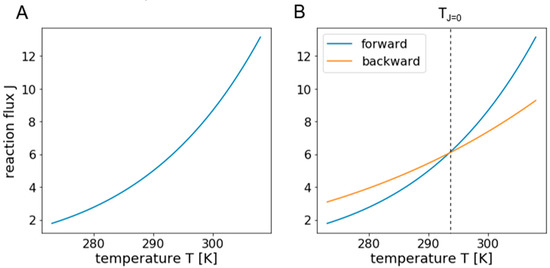 Illustration of exponential temperature response curves. Panel (A) shows a typical exponential temperature response curve of a reaction flux, following the Arrhenius equation. Panel (B) illustrates a case where the forward flux exceeds the backward flux of a reversible reaction at temperature TJ=0. The resulting net flux at this temperature is zero and changes its direction when passing it.