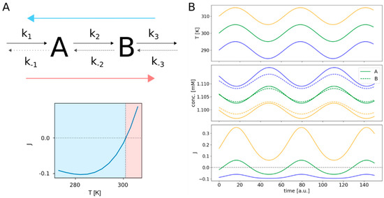 In the case of Reaction 2 of the linear network shown in Figure 3, this equates to about 301 K, the temperature at which the pathway indeed changes its flux direction. To further elaborate this, we performed simulations with periodically changing temperature as shown in Figure 3B. Here, we simulated the behavior of the linear pathway in response to a cyclically changing temperature over time for three different temperature regimes. One of the temperature curves cycles around the critical temperature TJ=0 at about 301 K. Another temperature curve is set to lower temperatures around 290 K and the last one serves higher temperatures around 310 K. As expected, the resulting flux response curve for temperatures around 300 K changes its sign periodically, switching from forward to backward direction. In contrast to this, the flux at higher temperatures keeps forward direction, only varying in extent. The same holds for the flux at lower temperatures; only here the maintained flux direction is backwards. Interestingly, there are big differences in the amplitudes of these oscillations, increasing from lower temperatures with small amplitudes to higher temperatures with bigger amplitudes, although the absolute changes in temperature for all three temperature curves are the same. Additionally, we notice that for positive (forward) fluxes, the concentration of species B is always higher than the concentration of A and vice versa for negative (backward) fluxes. Also, the concentrations of both species are generally lower for higher temperatures.