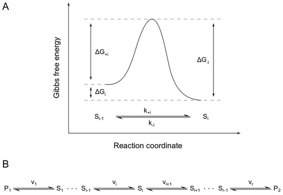 Energy diagram for a single reaction within a linear, reversible pathway. Panel (A) shows the Gibbs free energies of activation for the forward (ΔG+i) and backward (ΔG−i) direction of reaction i of the linear, reversible pathway shown in panel (B). Here, ΔGi is the difference in Gibbs free energy of the substrate Si−1 and the product Si.