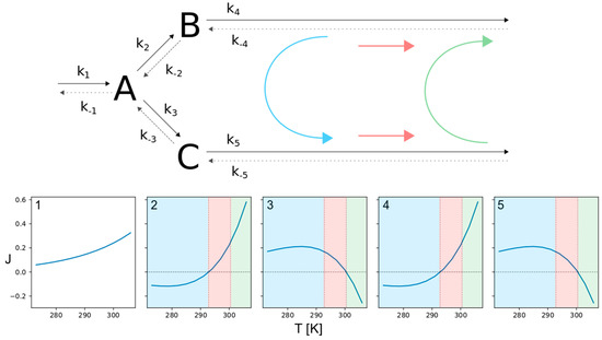 Looking at the lower temperature region, marked in blue, the fluxes enter from the left and upper branch, forming species A and B and leave through the lower branch via C. The intermediate temperature range, marked in red, is characterized by flux separation. While two incoming fluxes result in a single outgoing flux within the blue temperature region, here a single flux is split into two outgoing fluxes. It enters from the left branch forming A which is converted to both, B and C. The separated flux then leaves the network through the upper and lower branch. Eventually, there is a high temperature range, marked as green. Here the network behaves the same as in the blue region, but the roles of the upper and lower branches are reversed. So the fluxes enter through the left and lower branch, forming species A and C and leave through the upper branch via B. In this context, it is important to note that the transitions from one flux mode to another occur at temperatures where one or more of the reversible reactions change their direction of flux, satisfying Equation (18), as described for single reactions and linear pathways in 3.1. At the transition from the blue to the red flux mode, reactions 2 and 4 (upper branch) are reversed, followed by the reversal of reactions 3 and 5 (lower branch) at the transition from the red to the green regime.