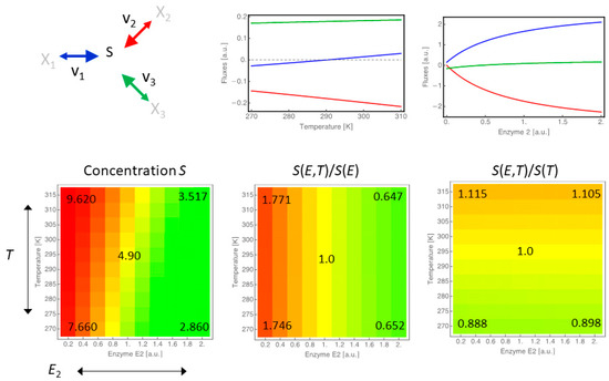 We see that the magnitude of the influence of enzyme concentration changes is bigger than sole temperature changes since fluxes and concentrations both change more drastically in response to it (note the different scales). Nevertheless, when comparing the shapes of the flux response curves, we also see that the type of response differs qualitatively, and when looking at the combined effects on the concentration of S, we find that temperature modulates the response to enzyme changes as it shifts the general abundance of S.
