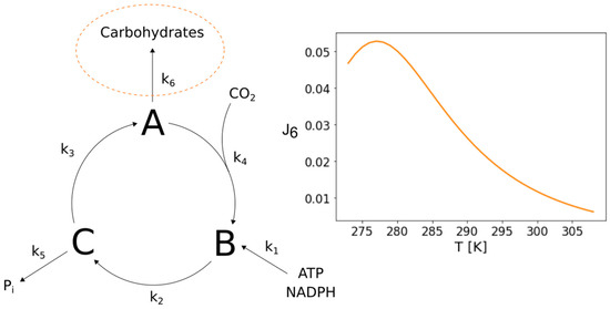 We also further analyzed the potential of the minimal Calvin–Benson cycle network presented by Ruoff et al. (2007) [10]. It is a minimal representation of the important cyclic reaction scheme also referred to as dark reaction of photosynthesis. The corresponding reactions comprise the essential processes of carbon fixation from CO2 by Rubisco, the reduction of the fixation product and the regeneration of ribulose-1,5-bisphosphate for the next fixation. When taking a closer look at the structure of this network, one realizes that it’s branching provides the potential to show bell-shaped temperature response curves, similar to the ones presented for CO2 fixation, at the other branch points as well. Consequently, we were able to identify a parameter set for which the network exhibits an increased flux towards carbohydrates at low temperatures, as frequently reported in literature [4,8]. The network and the corresponding temperature response curve are illustrated in Figure 7.