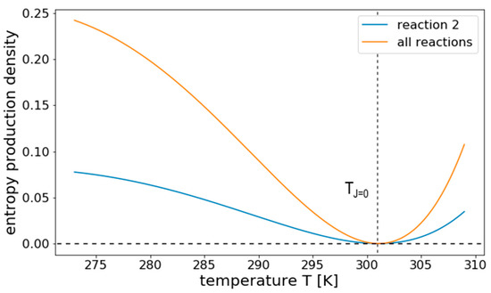 Applying this expression to the linear reaction network, shown in Figure 3, results in the temperature response curve for σ shown in Figure 8, considering only internal fluxes. We see that, here, entropy production has a clear minimum where it becomes zero. This minimum relates to the temperature at which also the net flux is zero, i.e., TJ=0. For temperatures away from this balanced state, σ increases in both directions, showing that it does not necessarily decrease with T as previous terms might suggest.